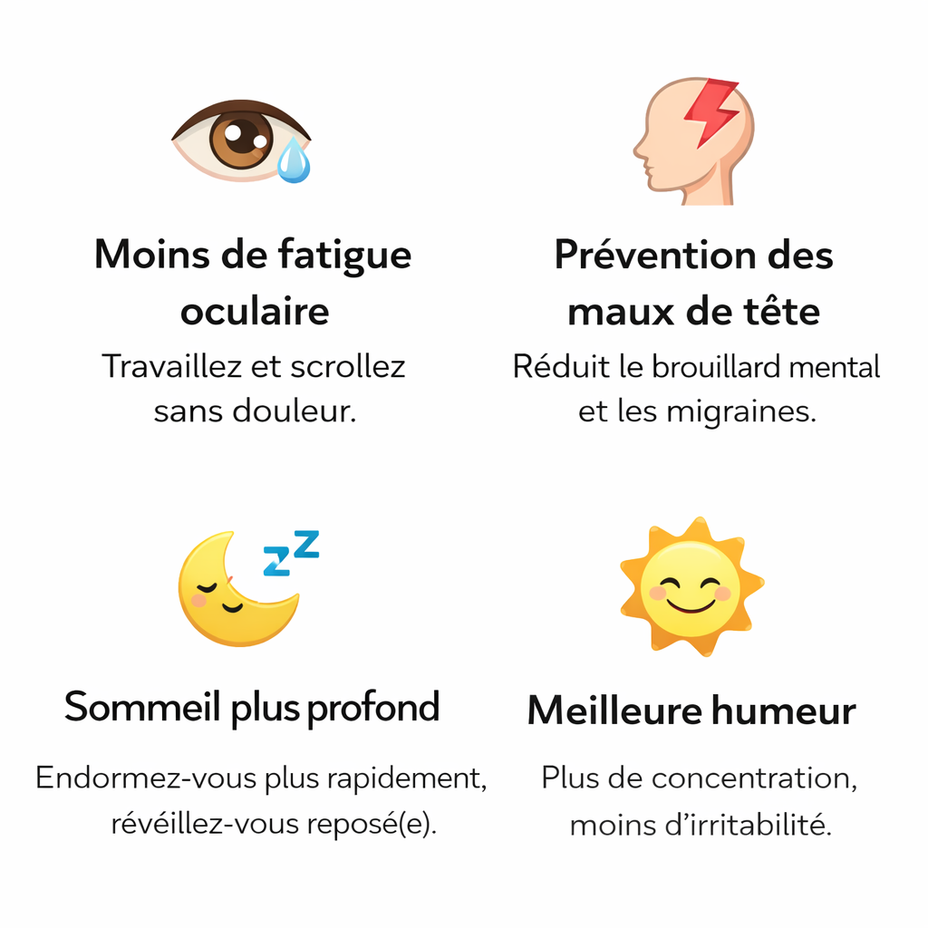 Oui, en bloquant la lumière bleue et verte nuisible, ces lunettes réduisent la fatigue oculaire, rendant le temps passé devant un écran plus confortable et minimisant la fatigue, les maux de tête et la vision floue.